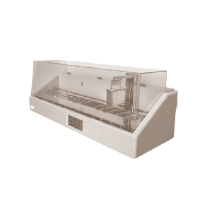 SLIDE STAINING MACHINE WITH TOUCH SCREEN: Linear Slide Stainer is an enclosed compact bench top unit. It has a user friendly software. The lowering and lifting of a tissue basket is smooth and noiseless. Features touch screen LCD with user friendly software. All the reagents are covered when not in use to minimize loss due to evaporation. Illumination of the working chamber enables clear view of the process. The whole equipment is enclosed and an exhaust fan is provided to dispose off reagent vapors away from the laboratory.