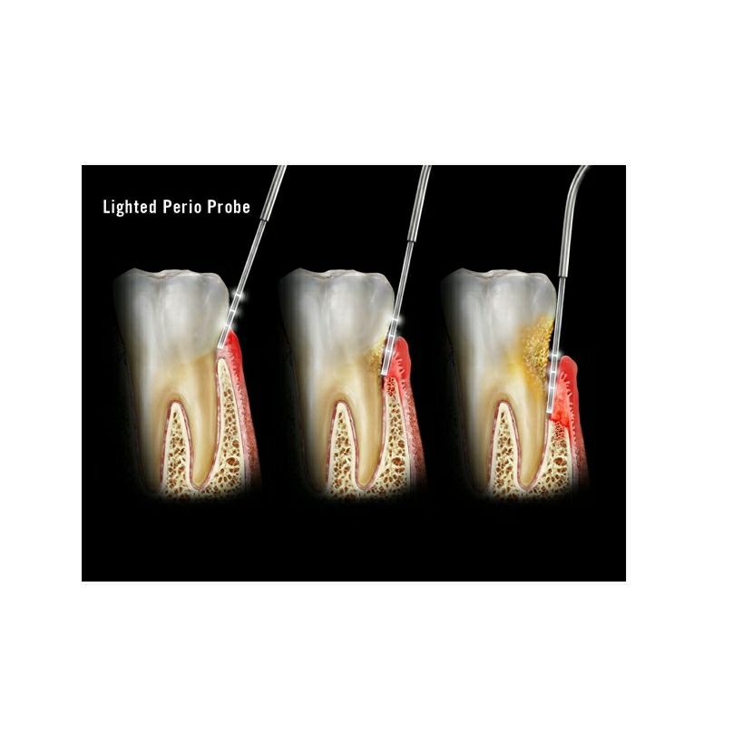 To detect the depth of pockets and gingival recession, use the Perio probe and insert the tip in the gingival sulcus. The depth indications on the illuminated fiber tip are 3mm, 5mm and 7mm.